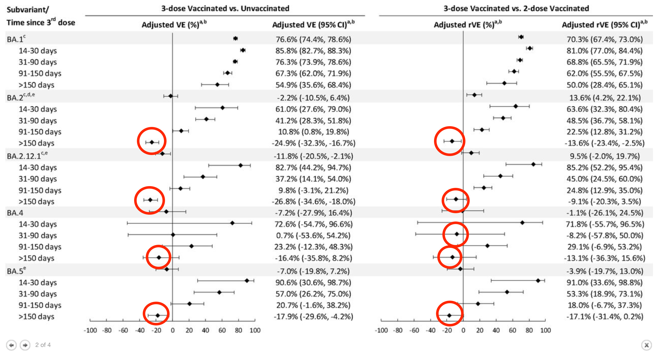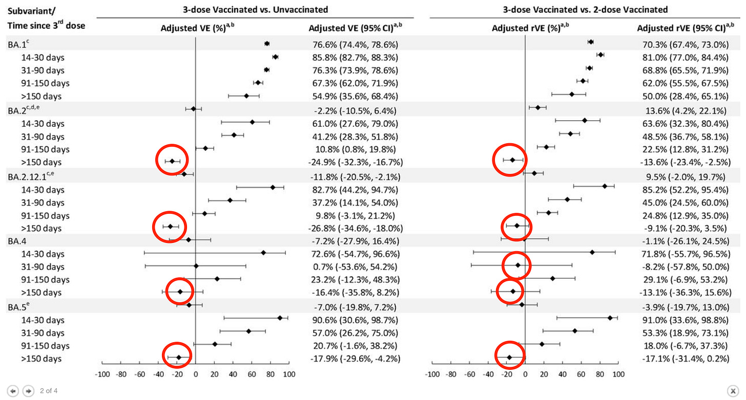 The red circles show negative effectiveness. They appear at the bottom of each variant category, showing how the vaccine provides some, though limited protection initially, which then not only disappears but becomes negative.
