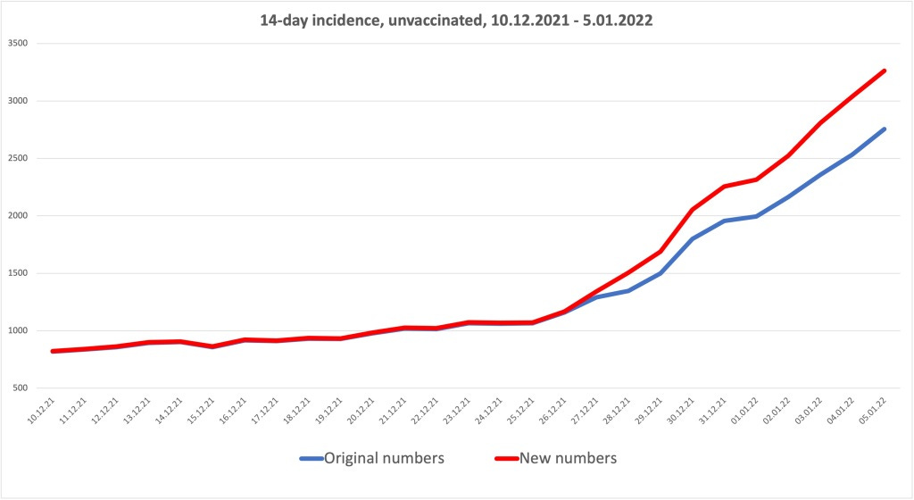It was finally on the morning of January 13th that the data appeared again. However, there was a snag: While the 14-day incidence of double- and triple-vaccinated adults and children was virtually unchanged, for the unvaccinated, the previously published numbers had taken an unexplained jump, starting on December 27 with a 4% increase, 11% the next day, then 12%, 14%, 15% and ending in a 20% increase on January 4th!