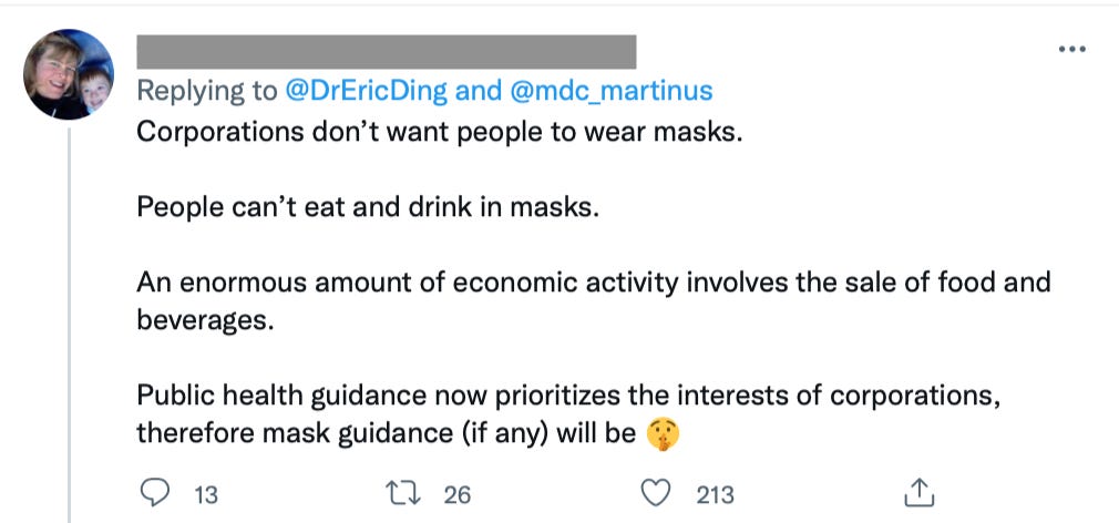 Mr. Feigl-Ding’s latest focus is the monkeypox outbreak, if we can call it an outbreak; a few cases of a relatively harmless disease with low transmissibility mainly within heterogenous groups of people. According to Mr. Feigl-Ding however, this is a deadly serious matter. In a tweet on June 6th, quoting a rather funny CDC recommendation that travellers should use masks on airplanes to protect themselves against monkeypox (which by the way is not even a respiratory disease), he asks the obvious question: “Why the heck was there no big CDC / media advisory on this?”